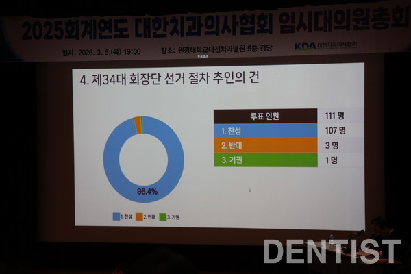 2호 안건인 ‘33대 집행부 및 직무대행 회무행위(이사회 의결사항)에 대한 승인의 건’은 총 투표 111명 중 찬성 105명, 반대 5명, 기권 1명으로 통과됐으며, 이번 안건으로 상정된 회무행위의 범위는 2024회계연도까지의 회무 및 제34대 치협 회장단 선거 관련 활동까지이다.